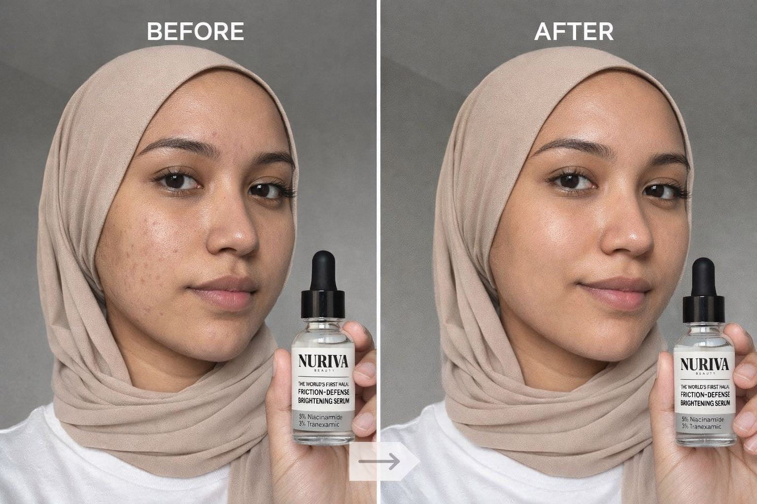 it delivers a clean, breathable finish perfect for hijab wearers and high temperatures. Powered by Halal, Dermatologist-Approved Science Our formula blends premium active ingredients with safe, 100% Halal-compliant components, respecting your values while delivering exceptional results. Niacinamide 5% — brightens, reduces spots, strengthens the barrier Tranexamic Acid 3% — targets stubborn pigmentation Soothing Hydration Complex — calms irritation from friction and heat Lightweight Texture — absorbs instantly, no stickiness, no pilling The result? Skin that stays clear, bright, smooth, and balanced—even in extreme heat.